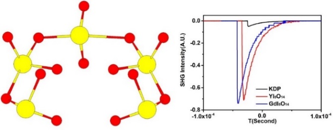 REI5O14 (RE= Y and Gd) 结晶于极性空间群 Cm。其中I5O14由三个IO4和两个IO3通过共顶角连接形成半圆形构型,具有较高的极化率。I5O14基团在单胞排列整齐,因此YI5O14 和GdI5O14均展现出了优异的倍频性能,分别为KDP的14倍和15倍。理论计算表明,I5O14多聚体对于YI5O14和GdI5O14倍频性能的贡献率分别为91.28%和92.62%。此外, 这两个晶体在可见到中红外波段均具有很好的透过性能。同传统的水热合成相比,磷酸能够有效地增强反应媒介的粘稠度,从而有利于碘酸根的聚合。该研究结果有望为碘酸盐NLO晶体的设计与合成提供一条简便有效的新策略。