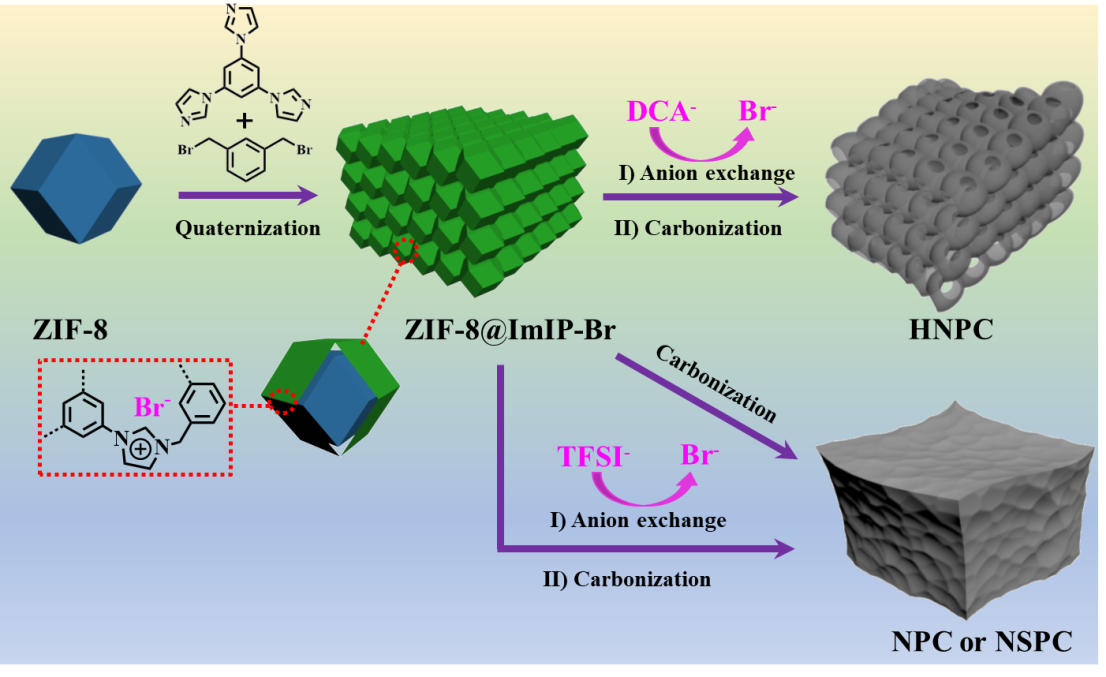 在国家自然科学基金(21471151,21673241)和中科院战略性先导科技专项(XDB20030200)的资助下,中科院福建物构所结构化学国家重点实验室王瑞虎课题组利用离子聚合物包覆的ZIF-8核壳结构(ZIF-)作为前驱体,采用阴离子交换策略引入双氰铵根离子(DCA),经高温碳化诱导核壳结构分解并相互交联,成功制备出一类相互连接的中空氮掺杂多孔碳材料(HNPC)。这种结构能够减小材料的界面电阻,增强对多硫化物的吸附能力,提高活性物质的利用率,使得电池在8@ImIP2 C的倍率下稳定循环800圈以后,仍能达到562 mA h g-1的比容量,电化学性能明显优于传统杂原子掺杂的碳材料。上述研究工作发表在Adv. Funct. Mater. 2019, 29, 1902322.(DOI: 10.1002/adfm.201902322),文章的第一作者是李忠林。