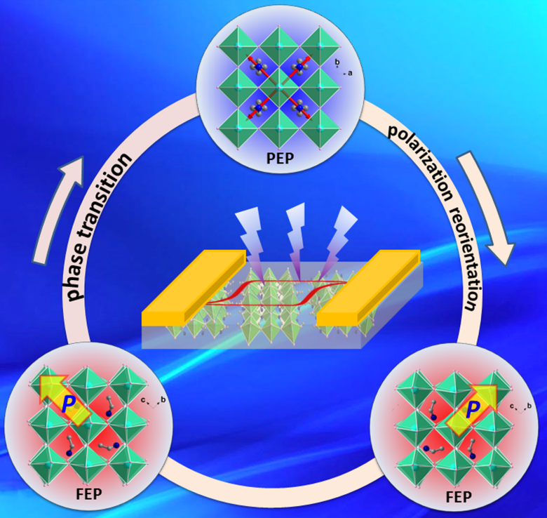 铁电体是一类重要的功能材料,它最显著的特性是材料内部的自发极化能够在外界条件(压力、电场、光等)下改变方向。与单轴铁电体相比,多轴铁电体具有多个等效极化方向,极化翻转更加容易。近年来,有机无机杂化钙钛矿因其丰富的物理特性,在光伏器件、存储器、传感器等领域具有广阔的应用前景。然而,基于杂化钙钛矿实现具有光伏效应的多轴铁电体仍然是需要解决的一个重要问题。