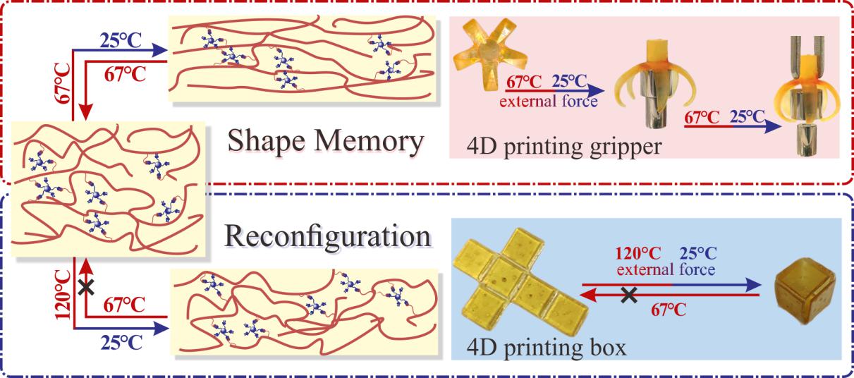 最近,中科院福建物质结构研究所、中科院功能纳米结构设计与组装重点实验室在科技部国家重点研发计划重点专项和海西院“一三五”重点培育项目的支持下,首次报道具有永久形状可重构性的4D打印形状记忆聚合物,设计合成了一种带有醛基的新型甲基丙烯酸酯单体(4-甲酰基苯甲酸2-(甲基丙烯酰氧基)乙酯,MEFB)和超支化硅氧烷交联剂(HPASi),构建出具有动态亚胺键的(甲基)丙烯酸酯体系(IEMSis),用以实现4D打印。 HPASi的柔性链结构显著提高了IEMSis的韧性,约为添加前的33-97倍。 HPASi的交联作用也赋予IEMSis良好的形状记忆性能,它们的形状固定率和形状恢复率分别为97.5-97.6%和91.4-93.7%。同时,在没有催化剂和相对温和的条件下,IEMSis可以通过亚胺键的动态交换实现应力松弛,使得4D打印的永久形状在特定条件下还可以重构,因而可望扩展4D打印技术的应用范围。相关研究成果发表在ACS Applied Materials & Interfaces(2019, DOI:10.1021/acsami.9b14145.)。博士后缪佳涛为该论文的第一作者。该研究采用林文雄团队研发的设备,成果已在海西院参股公司国锐中科应用。