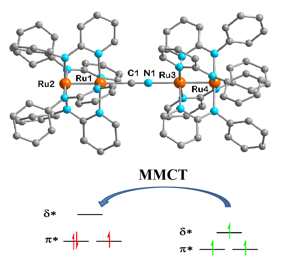 在中科院战略性先导科技专项和国家自然科学基金的资助下,中国科学院福建物质结构研究所、结构化学国家重点实验室吴新涛院士研究组盛天录研究员等人在前期氰桥混合价化合物及其金属—金属电荷转移(MMCT)的研究基础上,以混合价双核钌簇单元(Ru2V(ap)4)为基元,合成并详细表征了首例混合自旋氰桥四核钌化合物[Ru2(ap)4-CN-Ru2(ap)4](BPh4),林晨升副研究员通过理论计算解释了该混合自旋态形成的原因。研究表明,在该化合物中,与氰桥碳端相连的Ru2片段的自旋态为S=1/2的低自旋态,而与氰桥N端相连的Ru2片段的自旋态为S=3/2的高自旋态。紫外可见吸收光谱分析和TDDFT计算表明,在该化合物中存在由高自旋簇单元Ru2V(ap)4(S=3/2)向低自旋簇单元Ru2V(ap)4(S=1/2)的电子转移,这是具有相同价态但不同自旋态金属簇单元间MMCT的首次报道。相关研究结果发表在《德国应用化学》杂志(Angew. Chem. Int. Ed. 2019, 58, 15344 –15348),论文的第一作者是吴新涛院士和盛天录研究员共同指导的博士生苏少东。