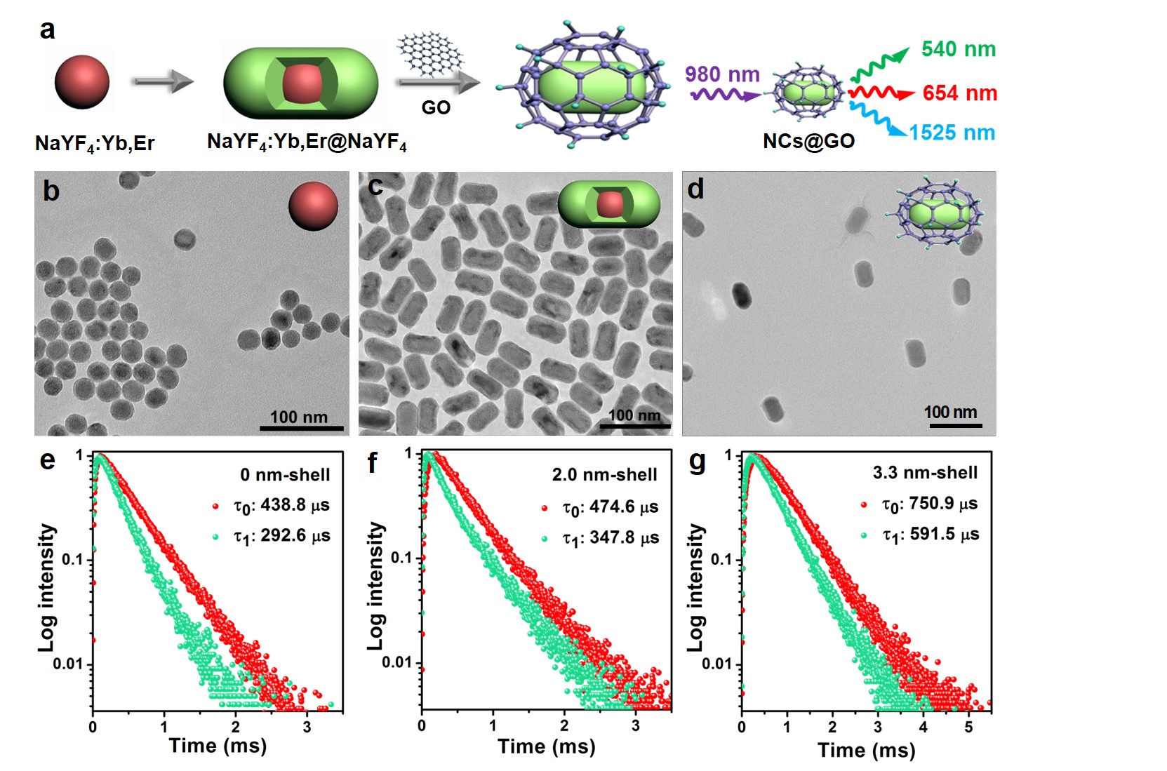 图1 a)NCs@GO合成示意图;b)NaYF4:Yb,Er内核与c)NaYF4:Yb,Er@NaYF4核壳结构的TEM明场像;d)NCs@GO的TEM明场像;e-g)Er3+ 4F9/2能级的荧光衰减曲线,其发光寿命通过单指数拟合得到。