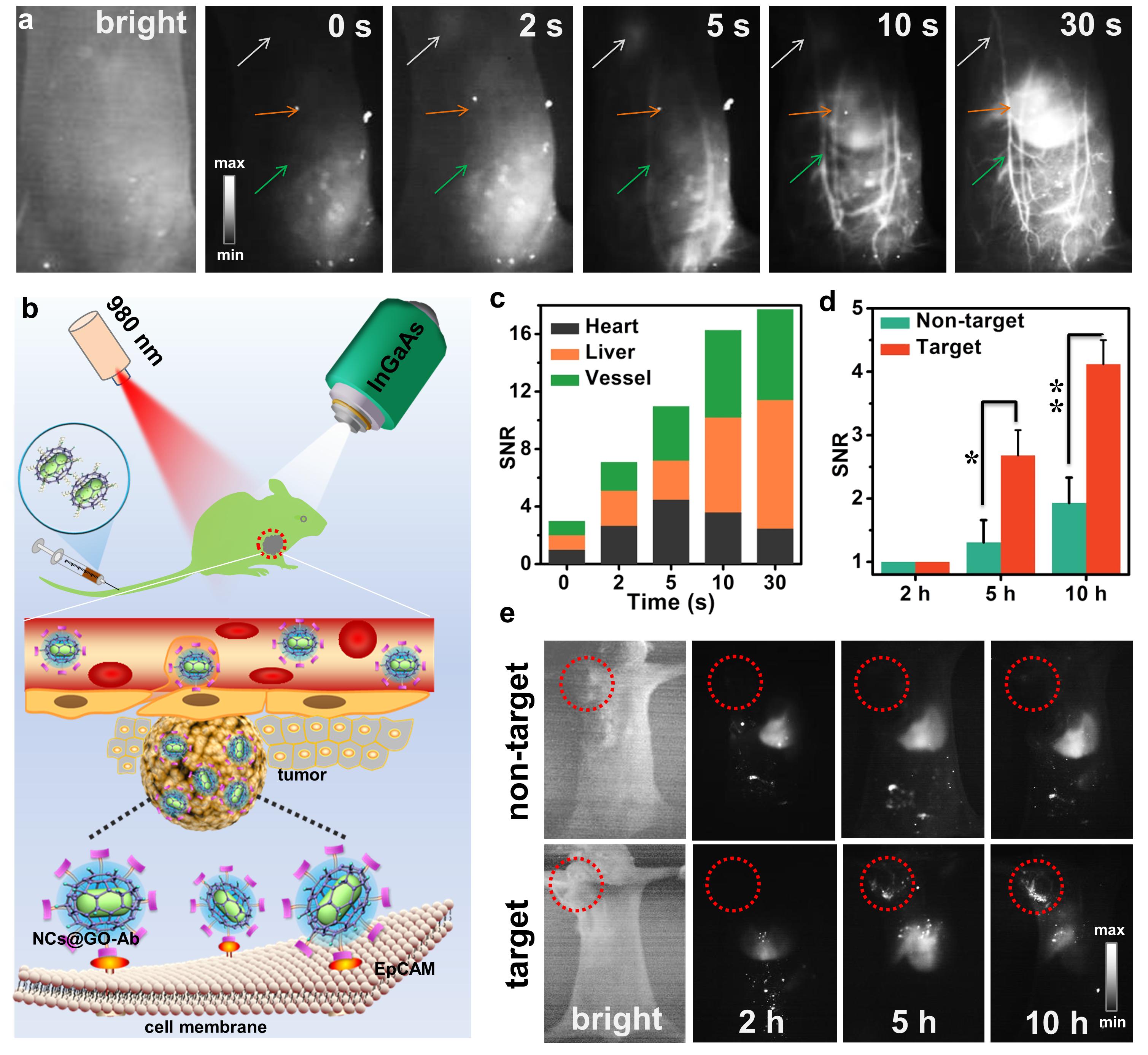图2 a)小鼠经尾静脉注射NCs@GO-PEG后的NIR-II成像图;b)肿瘤靶向NIR-II成像示意图;c)小鼠心脏、肝脏、血管处的NIR-II信号强度变化图;d)肿瘤区域的NIR-II成像信噪比变化图;e)小鼠NIR-II荧光成像图。