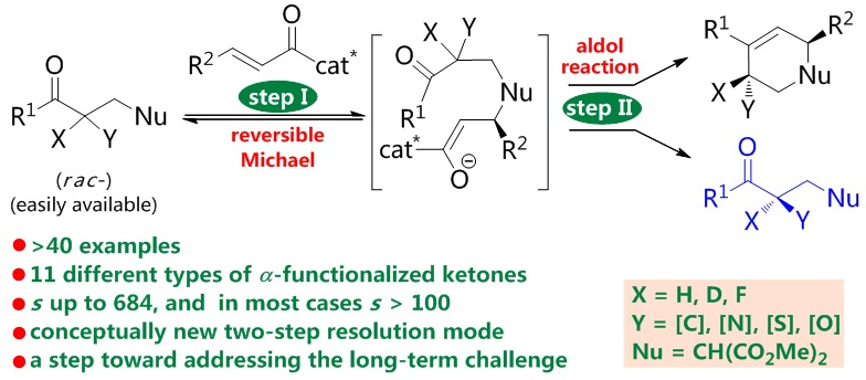 -官能团化酮类分子(选择性因子高达684),从而为这一领域长达79年的难题提供了解决方案。机理研究表明,基团添加而引发的双关键步动力学拆分是这一方法成功的关键。