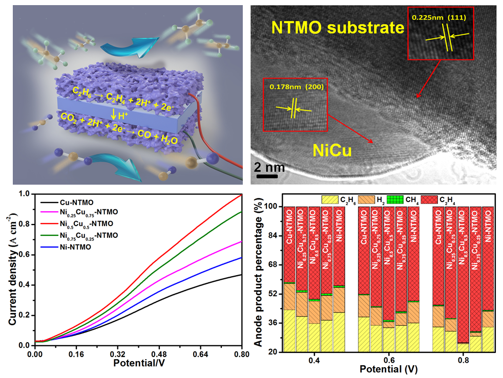 通过对Nb1.33(Ti0.8Mn0.2)0.67O4-δ(NTMO)掺杂并在表面原位铆合生长纳米NixCu1-x合金构筑金属-氧化物界面体系,以增强乙烷转化的电催化活性和抗积碳性能。电化学“抽取”质子实现高效的乙烷非氧化脱氢制乙烯过程,在常压、700℃及0.8 V下,乙烷转化率高达75.2%,乙烯选择性接近100%,运行100小时性能无衰减。相关成果发表在ACS Catal, 2020, doi.org/10.1021/acscatal.9b05409。论文的共同第一作者是张茜瑞和叶灵婷。