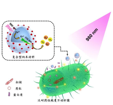 在国家自然科学基金面上项目、福建省自然科学基金、中科院先导专项等资助下,福建物构所结构化学国家重点实验室陈卓课题组与福州大学宋晓荣副研究员及中科院城环所苏建强研究员合作,将上转换纳米材料(LiYF4:Yb,Er)与光敏剂(孟加拉玫瑰红,Rose Bengale)通过静电作用结合,发展了一种利用近红外光源进行光动力灭杀泛耐药性鲍曼不动杆菌的复合型纳米材料。该复合型纳米材料通过静电吸附作用聚集在泛耐药性鲍曼不动杆菌表面,在近红外光源的激发下产生大量单线态氧等活性物质,破坏了该细菌细胞膜的完整性,导致细菌细胞内容物外泄从而达到杀菌效果(图1)。该上转换复合型光敏剂有效解决了传统光敏剂激发光穿透性差的问题,显著提升了光动力灭杀泛耐药性鲍曼不动杆菌效果,且由于其杀菌机制是通过细菌细胞内容物外泄而导致细菌死亡,不易产生耐药性,有效遏制了其耐药性的获得。相关成果已发表于Nanoscale, 2020, DOI:10.1039/d0nr01073a, 文章的第一作者为陈卓课题组的博士研究生刘雯珍。该研究成果为临床噩梦般的耐药菌寻找高效、快速且不产生耐药性的抗菌疗法提供了一个崭新思路和研究方向。