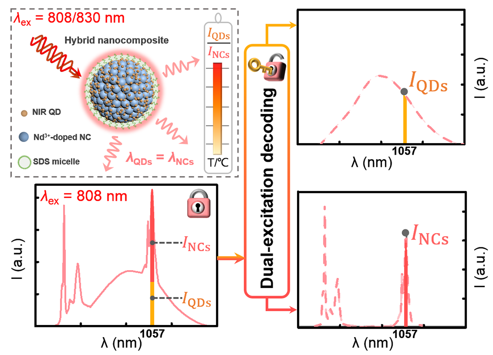 图1、基于稀土纳米晶/量子点复合材料的双激发解码策略实现精准温度探测的示意图