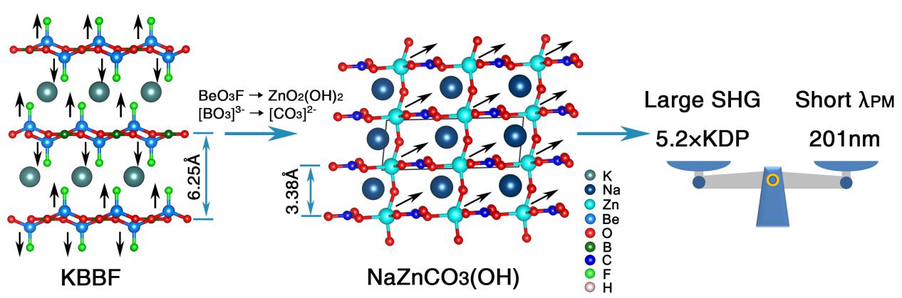 在中科院战略性先导科技专项、国家自然科学基金等项目的资助下,福建物构所中科院光电材料化学与物理重点实验室叶宁课题组基于功能基元替换的思想,以平面三角形基团[CO3]2-和四面体基团ZnO2(OH)2分别替换KBBF结构中的[BO3]3-和BeO3F基团,首次在碳酸盐体系中成功构筑一例完全具备KBBF结构特征的新型羟基碳酸盐紫外非线性光学晶体——NaZnCO3(OH)。与KBBF结构中的[BO3]3-基团一样,该晶体中的[CO3]2-基团保持平行共面一致排列,更为优异的是,该晶体中ZnO2(OH)2四面体基团不仅实现了上下功能层之间的完全自连接,而且通过适宜的排列为晶体倍频效应的提升做出了显著贡献。这些结构特征使得该晶体的倍频效应达到5.2倍KDP,双折射率达到0.114(@1064nm),通过理论计算得到的最短相位匹配波长可以达到201nm。说明该晶体是一例优秀的短波紫外非线性光学晶体备选材料。该晶体独特的结构构型也将为新型紫外甚至深紫外非线性光学晶体的设计提供新的思路。
