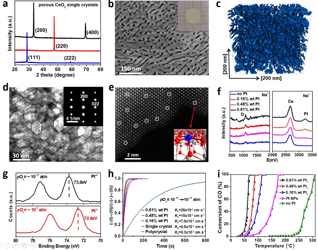 在国家重点研发计划变革性技术重点专项、国家基金重大研究计划重点项目、中科院洁净能源联合基金和中科院战略先导B等项目支持下,中科院功能纳米结构设计与组装/福建省纳米材料重点实验室谢奎课题组通过晶格重构策略生长出了2 cm尺寸具有三维连通孔道结构的介孔CeO2单晶,并利用原子层沉积(ALD)技术在多孔单晶扭曲表面上构筑了清晰的单位点Pt1/CeO2活性结构。这种Pt1/CeO2局域结构显著地提高了与Pt离子相连的晶格氧活性,在67 ℃时实现CO完全氧化,并且运行300个小时后无衰减。宏观尺寸多孔单晶可有效调控扭曲表面及精细结构,为后续在表面活性位设计与构筑提供了新的策略。相关成果发表在Angew Chem Int Ed, https://doi.org/10.1002/anie.202013633。论文的第一作者是博士生肖勇纯。