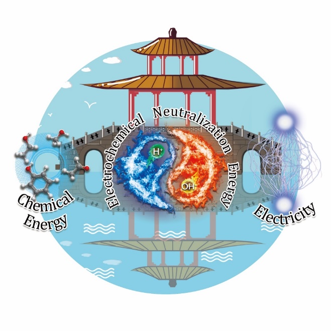 针对上述科学问题,中国科学院功能纳米结构设计与组装/福建省纳米材料重点实验室温珍海研究团队近年来在水系电化学能源体系开展了系列创新性地探索研究,通过设计具有pH敏感效应的阴、阳极反应,构建具有“混合碱/酸电解液”的电化学体系,将酸碱中和反应的热能以电能(电化学中和能)的形式进行收集,能够突破传统水系电化学能源体系的性能瓶颈:一方面可以优化阴、阳极电化学反应的pH环境,另一方面可以拓宽水系电池的工作窗口(>1.23 V)以提高电池能量密度,或者降低电解合成过程所需施加的电压以减少电耗。