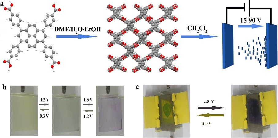 中国科学院福建物质结构研究所结构化学国家重点实验室曹荣课题组和刘天赋课题组合作,利用电泳法快速、便捷地制备了一种具有长循环寿命、可逆电致变色性能的氢键有机框架薄膜。进一步把具有氧化还原活性的Fe离子修饰在颗粒表面及内部缺陷中残留的羧酸基团上,可以实现材料更丰富的颜色变化。此外,材料可以通过简单的淋洗-重结晶-重新电泳的方法再生。值得一提的是,为了进一步证明HOFs薄膜的实用性,该研究团队将制备的薄膜组装成器件,其表现出与薄膜相似的电致变色行为。