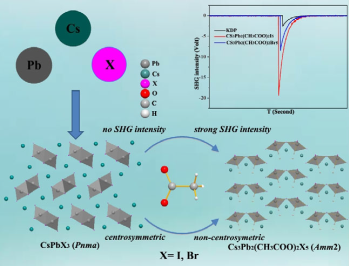 图:CsPbX3 (X = I,Br)到Cs3Pb2(CH3COO)2X5 (X = I, Br)的结构变化及后者SHG响应