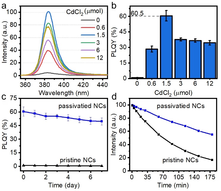 图3、不同CdCl2浓度处理CsPbCl3:Cd2+纳米晶的(a)发射光谱和(b)荧光量子产率。(c)330-nm 氙灯激发下,基于CdCl2表面钝化前后CsPbCl3:Cd2+纳米晶的荧光量子产率随时间变化曲线。(d)85 °C加热下,基于CdCl2表面钝化前后CsPbCl3:Cd2+纳米晶的紫外发光强度随时间变化曲线。