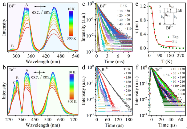 图3、(a) Cs2SnCl6: 1.1%Bi3+微晶的变温激发(λem = 456 nm)和发射(λex = 347 nm)光谱;(b) Cs2SnCl6: 5.6%Te4+微晶的变温激发(λem = 565 nm)和发射(λex = 382 nm)光谱;(c,d) Cs2SnCl6: 1.1%Bi3+的变温荧光衰减曲线(λem = 456 nm);(e)Bi3+的荧光寿命随温度变化关系及三能级模型;(f)Cs2SnCl6: 5.6%Te4+的变温荧光衰减曲线(λem = 565 nm)。