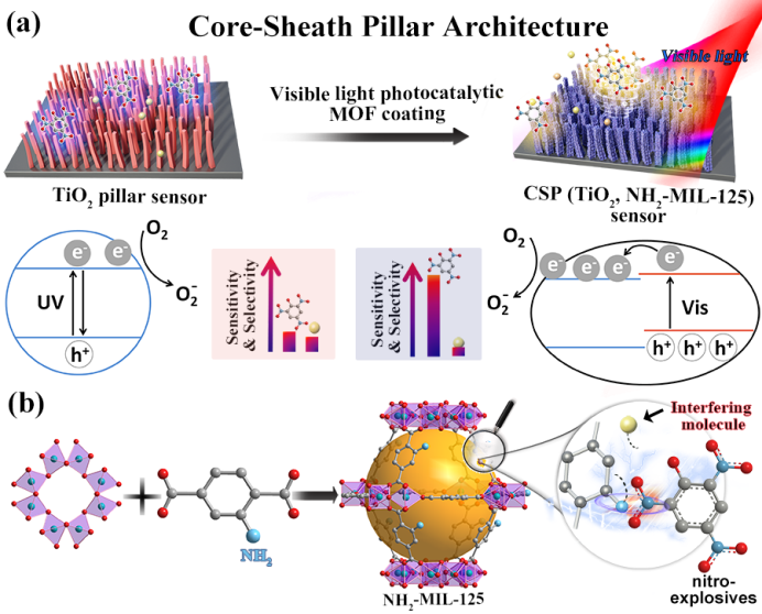 金属有机框架(MOFs)具有较高的比表面积,同时易被功能基元修饰,可以选择性的预富集痕量气体。近日,中国科学院福建物质结构研究所徐刚课题组与李春森课题组,北京理工大学王博课题组和京都大学北川进课题组组成合作团队,构建了一种以TiO2纳米线阵列为核,微孔配位聚合物NH2-MIL-125取向薄膜为鞘的核鞘阵列复合材料CSP (TiO2,NH2-MIL-125)来解决MOs基化学电阻型传感器室温检测痕量爆炸物选择性差,灵敏度低的瓶颈问题。