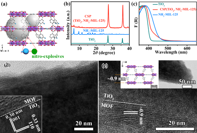 (a)NH2–MIL–125的结构;TiO2,NH2–MIL–125和CSP (TiO2,NH2–MIL–125)的(b)XRD和(c)漫反射光谱;CSP (TiO2,NH2–MIL–125)的侧边(d)和顶部(e)的HR-TEM图像。