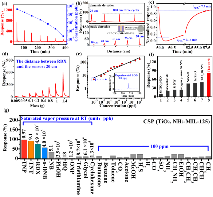 CSP (TiO2, NH2-MIL-125)在常温及可见光辅助下检测RDX时的气敏性能:(a)浓度依赖的响应-恢复曲线,(b)距离依赖的响应-恢复曲线,(c)响应-恢复时间 (d)质量依赖的响应-恢复曲线,(e)响应值-浓度标准曲线,(f)与已发表材料性能对比,(g)选择性。