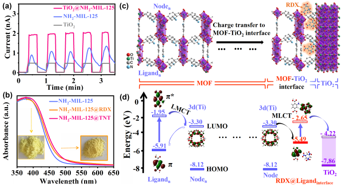 (a)CSP (TiO2,NH2-MIL-125),NH2–MIL–125与TiO2在可见光下的光电导,(b)NH2-MIL-125吸附RDX前后的紫外-可见吸收光谱,(c)TiO2,NH2-MIL-125及其与RDX分子接触界面的结构,(d)NH2-MIL-125中的有机配体,金属节点以及RDX吸附在有机配体界面的能级图和前沿分子轨道。