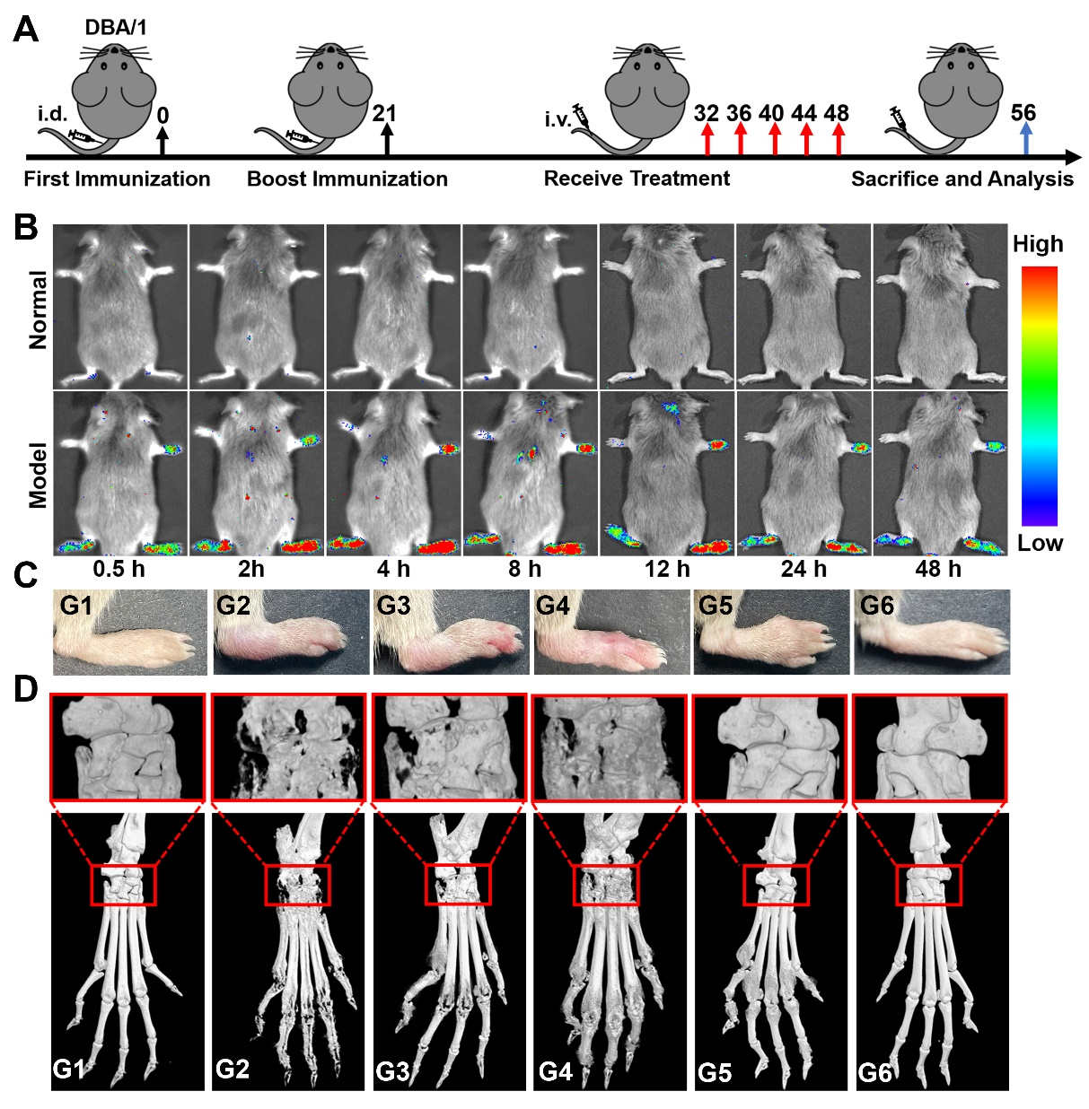 图2:(A)RA小鼠模型治疗示意图;(B)静脉注射稀土纳米探针之后,小鼠的代表性余辉成像图片;(C)治疗结束后,不同分组中小鼠的代表性右后爪照片;(D)治疗结束后,不同分组中小鼠的右后爪代表性微CT图像。其中G1:正常小鼠, G2: RA小鼠接受PBS治疗, G3: RA小鼠接受PBS加光照治疗, G4: RA小鼠接受ICG加光照治疗, G5: RA小鼠接受MTX药物治疗, G6: RA小鼠接受mZMI@HA加光照治疗。