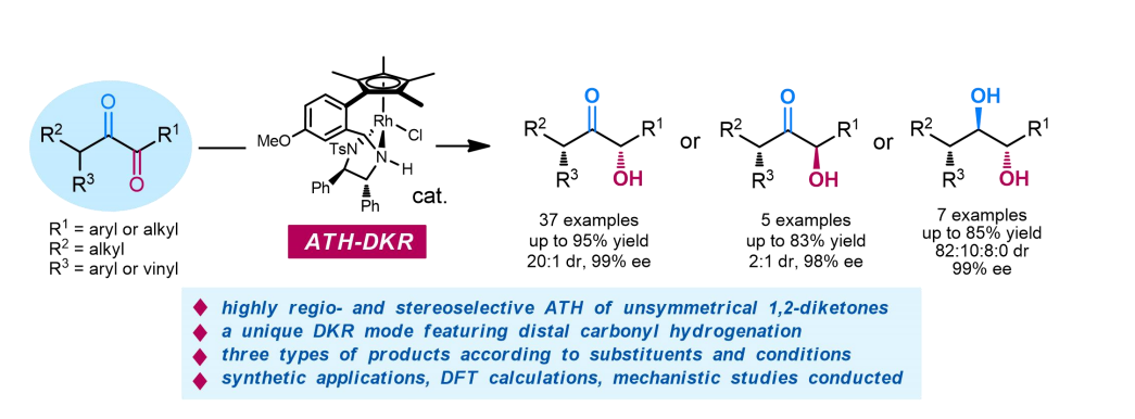 不对称转移氢化从上世纪90年代诺贝尔奖获得者Noyori的开创性报道之后得到迅速发展。这一反应使用甲酸或异丙醇等作为氢源,反应条件温和,不使用特殊压力设备,已经成为学术界的研究热点领域之一,并在工业化生产中得到了广泛应用。然而,高度区域选择性不对称转移氢化1,2-二酮却一直是这个领域尚未解决的难点,仅在2000年的时候Ikariya课题组做过尝试,但结果并不理想;此后的20多年里就再没有新的相关报道出现。