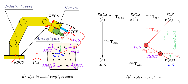 近日,中国科学院福建物质结构研究所杨永泰课题组,在前期航空结构自动化制孔相关研究基础上,发展了一种机器人装配系统定位精度增强技术。对机器人装配系统与航空结构相对定位误差的形成进行了分析和建模,引入测量装置实现相对定位误差测量和补偿,从容差管理的角度对测量装置不同配置方式下的相对定位误差进行了理论比较,推荐了视觉系统手眼配置方式。基于定位误差雅克比,探索了手眼偏置对定位精度的影响,指导了末端执行器设计和视觉坐标系设置。提出了在机手眼标定和系统定位方法,消除了机器人绝对定位误差相异的影响。进而开发了多功能机器人装配系统的集成控制系统。该研究为航空结构机器人制孔和连接系统的定位精度增强提供了理论依据。