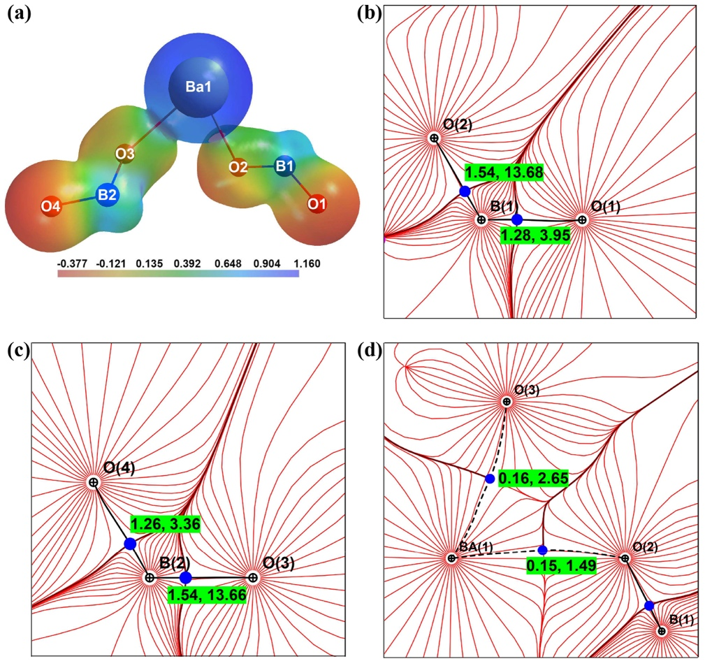 -3处的静电势等值面图,蓝色和红色分别代表正电荷区和负电荷区;b,c,d分别代表O(1)B(1)O(2)、O(3)B(2)O(4)和O(2)Ba(1)O(3)面的实验电子密度梯度轨迹图。图上蓝色点表示键临界点,靠近键临界点的两个数字分别为键电荷和拉普拉斯量。