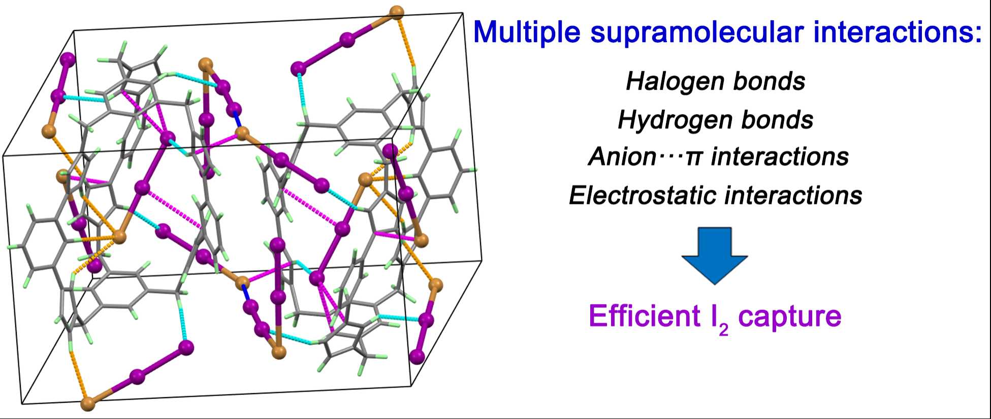近日,中国科学院福建物质结构研究所结构化学国家重点实验室孙庆福课题组在咪唑鎓基有机分子笼碘吸附研究取得进展。研究人员首先通过一锅法高效合成了六价阳离子型咪唑鎓基共价分子笼,通过阴离子置换得到具有不同抗衡离子的分子笼材料(Cage X, X = Cl-, Br-, I-, PF6-)。碘吸附实验首次揭示了抗衡离子在材料碘吸附性能中的关键调控作用。其中,Cage Cl表现出超高的碘蒸气吸附能力(5.89 g g-1, 348 K),而在碘的正己烷溶液中Cage I表现出超快的碘去除能力(> 99% in 5 min),Cage PF6则可以快速地吸附水相中的碘(> 99% in 1 min)。不同的碘吸附行为可以归因于不同抗衡离子的卤键受体能力和分子量的差异。更重要的是,研究人员通过单晶X射线衍射在分子水平揭示了分子笼的碘结合模式:碘分子首先与卤离子通过卤键形成多碘阴离子,多碘阴离子通过氢键、卤键、阴离子 以及静电作用等多重非共价相互作用固定在分子笼内部空腔及其网络之间。