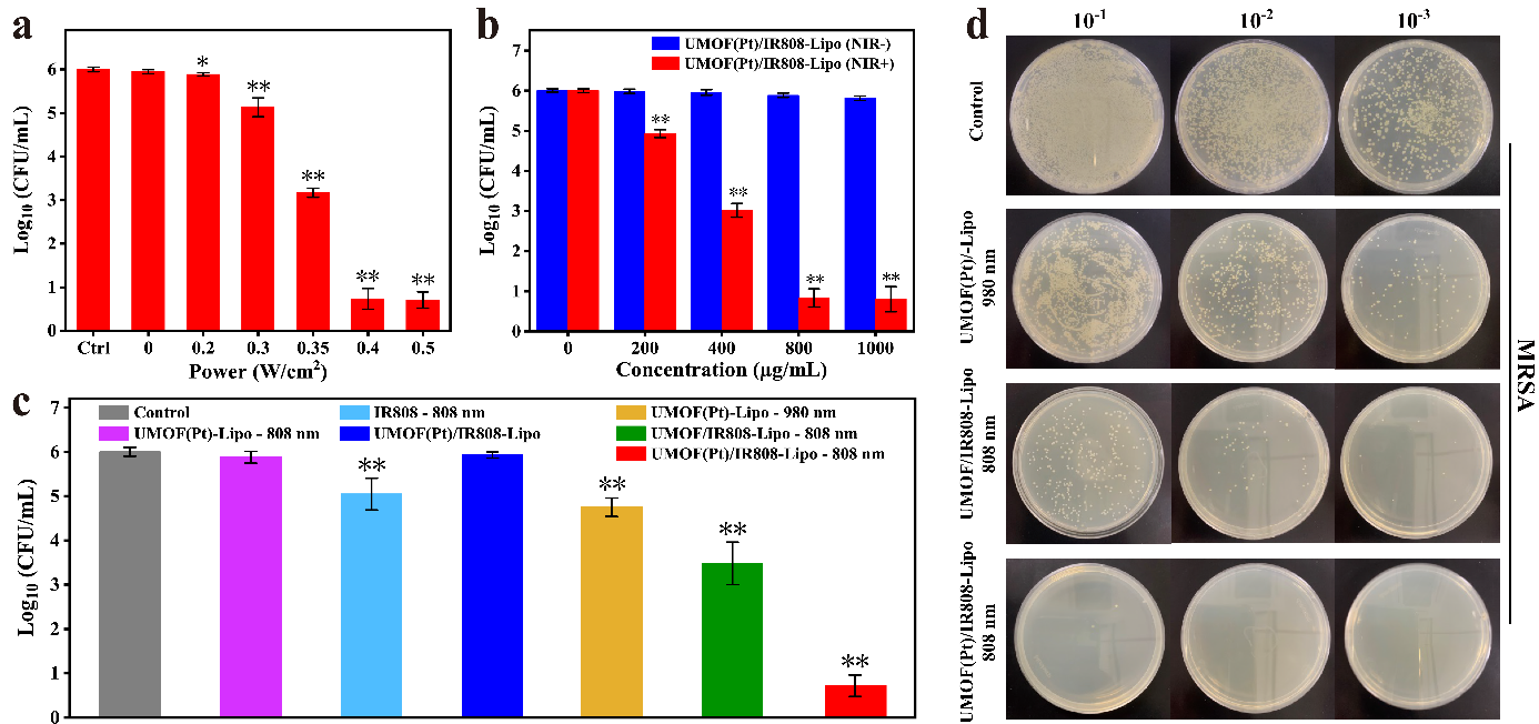 图2. UMOF(Pt)/IR808-Lipo纳米平台的PDT抗菌实验:a)不同功率密度(0-0.5 W/cm2)的808 nm激光辐照下UMOF(Pt)/IR808-Lipo的抗菌效果;b)功率密度为0.4 W/cm2的808 nm激光辐照下,不同浓度(0-1000 g/mL)UMOF(Pt)/IR808-Lipo的抗菌效果;c) UMOF(Pt)-Lipo、IR808、UMOF/IR808-Lipo和UMOF(Pt)/IR808-Lipo在不同光照条件下对MRSA的抗菌效果;d) UMOF(Pt)-Lipo、UMOF/IR808-Lipo和UMOF(Pt)-Lipo在不同光照条件下对MRSA的抗菌效果照片