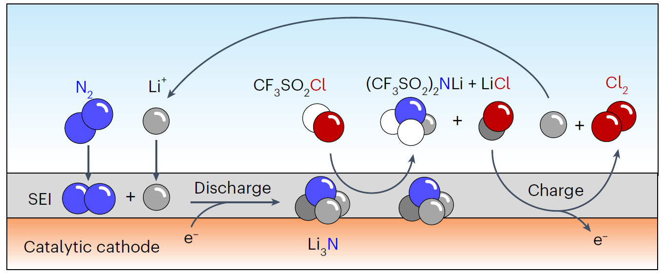 图1. Li-N2电池电化学合成LiTESI的级联反应示意图