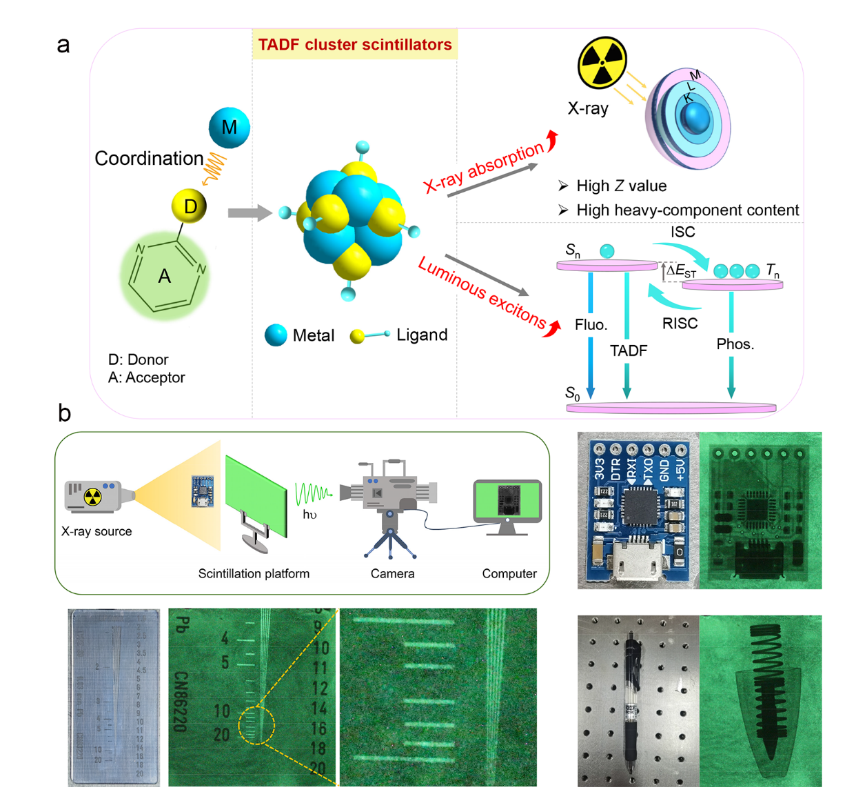 图1 (a) 热活化延迟荧光币金属团簇闪烁体的设计概念图; (b) SC-Ag团簇的X射线成像图