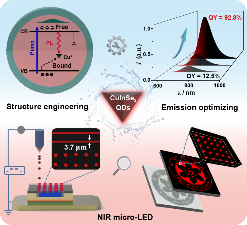 近期,中国科学院福建物质结构研究所/闽都创新实验室的陈学元团队涂大涛研究员等在国家自然科学基金重点项目和区域创新发展联合基金等项目支持下,成功研发出CuInSe2:Zn2+(CISe: Zn2+)基高效近红外量子点荧光粉,并首次将其应用于micro-LED(图1)。