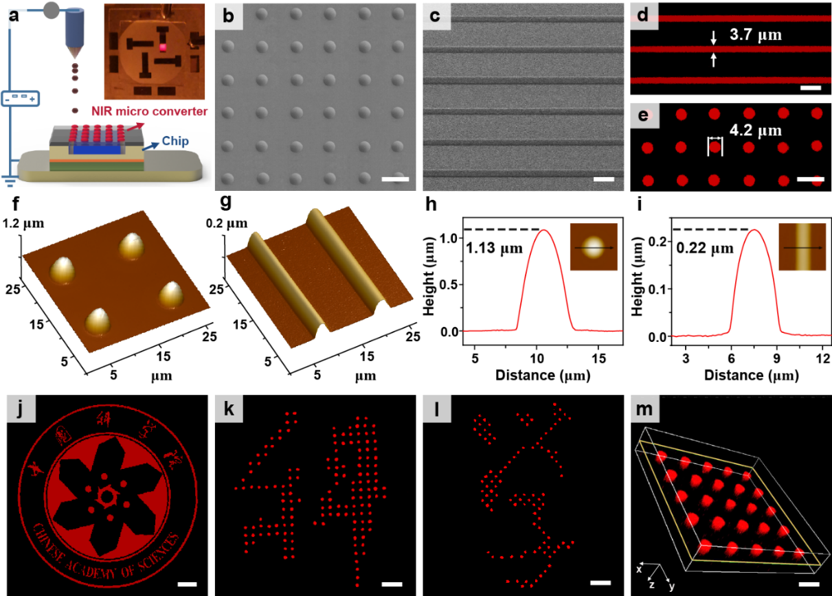 图2、(a)制备micro-LED示意图。Micro-LED阵列的(b-c)扫描电镜图、(d-e)近红外荧光图像和(f-i)原子力显微镜图。基于micro-LED阵列喷印的(j)荧光图案和(k-m)局部放大荧光图像
