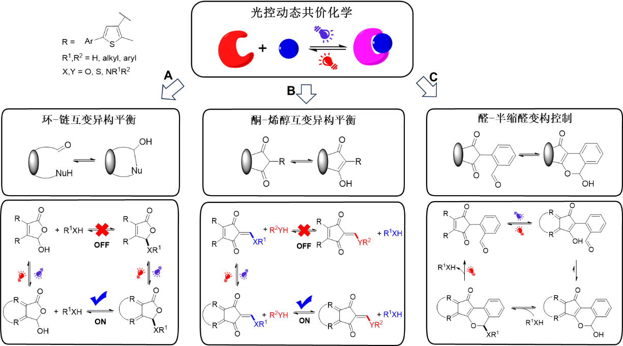 图1 基于环-链互变异构(A)、酮-烯醇互变异构(B)、级联变构控制(C)的光控动态共价化学