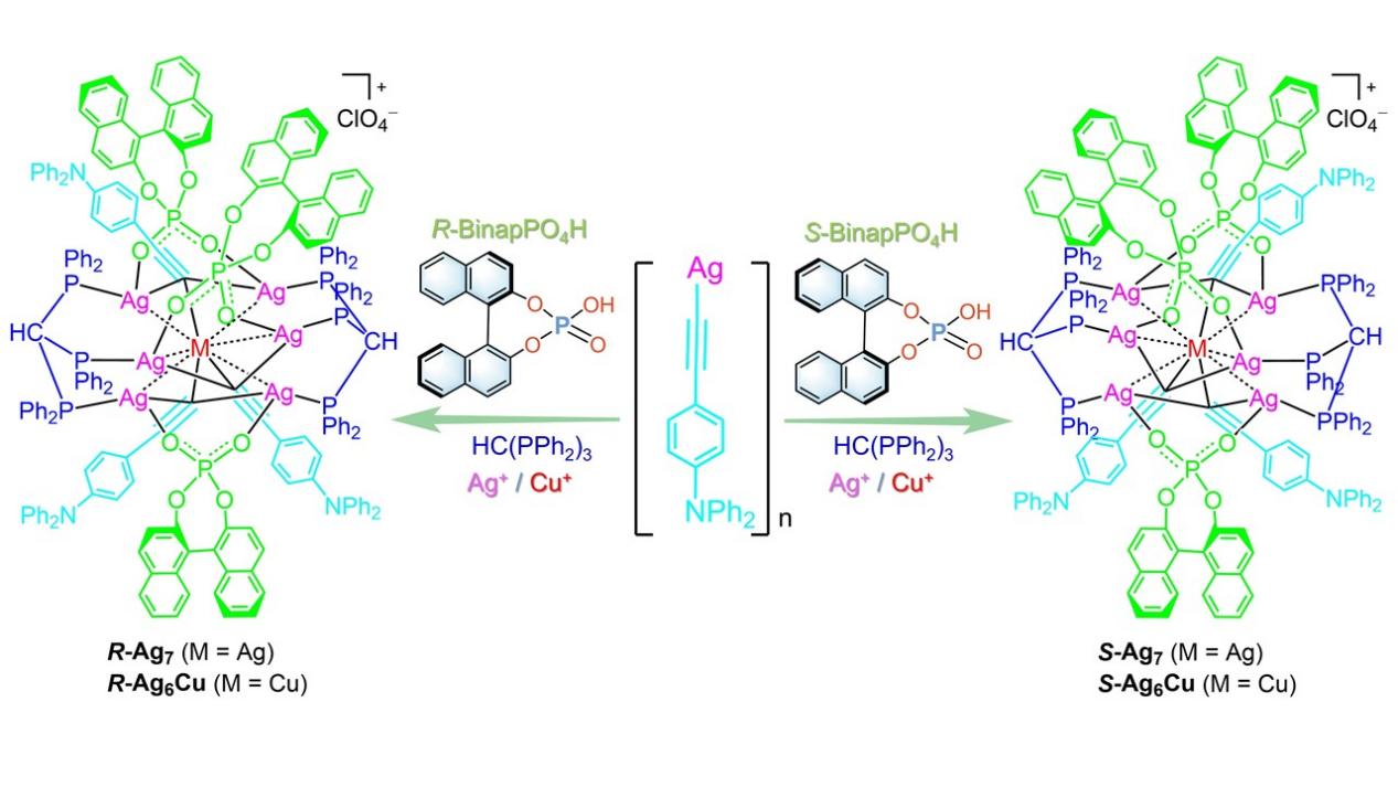 图1. 手性金属团簇对映体R/S-Ag7和R/S-Ag6Cu的合成路径