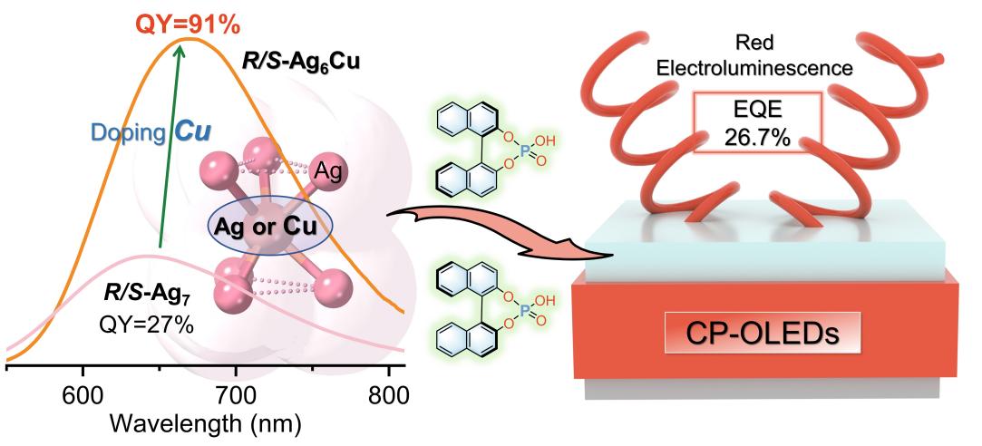 近日,中国科学院福建物质结构研究所陈忠宁课题组报道了一种简便但可行的合成策略,用于精准制备手性合金团簇对映体。与同核团簇对映体R/S-Ag7相比,合金团簇对映体R/S-Ag6Cu具有更高的发光效率、更好的热力学稳定性和更优的圆偏振发光(CPL)性能。通过将同金属团簇R/S-Ag7中心的一个Ag(I)原子替换为Cu(I)原子,以85%-87%的高产率实现了手性合金团簇R/S-Ag6Cu的精准高效合成。由于S1(最低能激发单线态)和T1(最低能三线态)之间的能垒相当小(约0.07 eV),R/S-Ag6Cu通过反系间窜越实现了高效率的热活化延迟荧光(TADF)。因此,在常温下,R/S-Ag7和R/S-Ag6Cu的光致发光(PL)主要产生于TADF(占比85%和86%),而不是磷光(占比15%和14%)。由于Cu(I)的掺杂显著加快了系间窜越(ISC)和反系间窜越(RISC)速率,使R/S-Ag6Cu(em = 91.8%-90.3%)的光致发光量子产率提高到R/S-Ag7(em = 28.0%-26.9%)的三倍多,而且还由于更强的Ag-Cu相互作用使合金团簇结构更加刚性化,致使R/S-Ag6Cu的圆偏振发光(CPL)不对称因子相对于R/S-Ag7翻倍。另外,R-Ag6Cu在300℃下保持不变,而R-Ag7在200℃以下开始分解,表明Cu(I)的掺杂显著提高了合金团簇的热力学稳定性。利用R/S-Ag6Cu作为发光材料,采用溶液法制备的圆偏振有机发光二极管(CP-OLED)表现出高效的圆偏振电致发光性能,其外量子效率(EQE)为26.7%,优于大多数通过溶液加工的红光OLEDs。