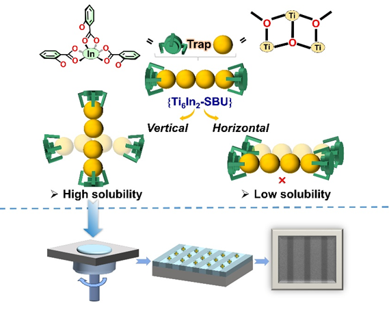 金属氧簇在纳米光刻技术中展现巨大的潜能,但精确控制其结构和组成以提高溶液可加工性和薄膜性能仍面临重大挑战。为此福建物质结构研究所张健团队创新性的采用配体调控策略,用于模块化组装铟-钛氧簇,并首次将其应用于纳米光刻。他们以铟基柔性三齿配体InL3作为金属配体(L=水杨酸衍生物),稳定了具有不同球形外壳的异构体In4Ti12氧核(InOC-20V、InOC-21V、InOC-22V和InOC-23H)。这些异构体表现出显著不同的溶液可加工性。其中,InOC-20V到InOC-22V因具有垂直连接的Ti6In2次级结构单元(SBUs),溶解性优于具有平行连接Ti6In2-SBUs的InOC-23H。此外,有机外围配体对薄膜形成至关重要,只有水杨酸基团修饰的InOC-20V可通过旋涂形成高质量薄膜,并实现50 nm分辨率的光刻图案,最终发现脱羧和交联是光刻图案形成的关键。该工作不仅提供了可推广的合成方法以扩展铟-钛氧簇的结构化学,还凸显了定制化结构调控在提升溶液可加工性和光刻性能方面的有效性,为未来材料设计和应用提供了宝贵见解。