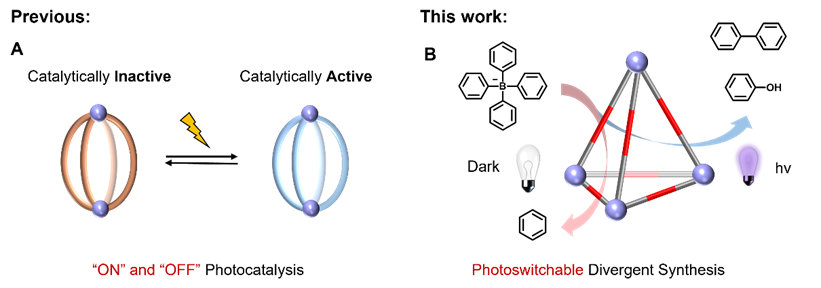 自然界的光合作用系统通过精妙的光控机制实现能量与物质的高效转化,而人工模拟这一过程始终是化学领域的重大挑战。传统光开关催化剂多局限于活性“启停”控制,难以在单一催化剂内实现产物路径的主动切换。金属有机笼凭借其可定制的空腔微环境,为调控反应选择性提供了理想平台。然而,现有分子笼体系大多依赖多笼协同或结构重组才能实现光切换催化,开发具有光控双路径催化发散合成能力的单一分子笼体系仍充满挑战。