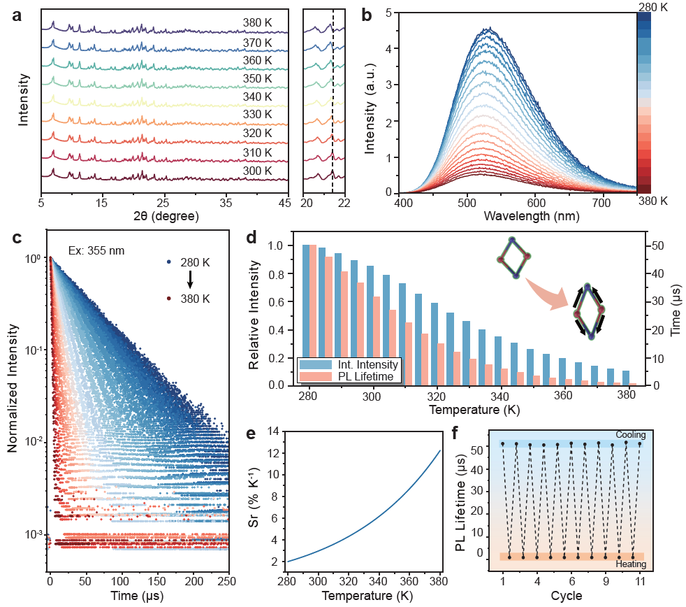 团队以疏水有机分子三苯基膦(TPP)为A位组分,设计合成了新型有机无机杂化Cu(I) 基金属卤化物TPP3Cu2Br2。在紫外光激发下,材料呈现绿色发光,量子产率达41.5%。TPP3Cu2Br2的结构会随着温度上升而发生剧烈热膨胀,由此引入更多的缺陷促使材料的发光快速猝灭。随着温度从280 K升到380 K,发光强度猝灭至初始值的10.8%,而荧光寿命则缩短至初始值的1.9%。由此计算出的荧光寿命温度传感的最大相对灵敏度高达12.8% K-1,为目前非掺杂金属卤化物的最高值。此外,通过循环测试也验证了其作为温度探针长期使用的良好稳定性(图1)。