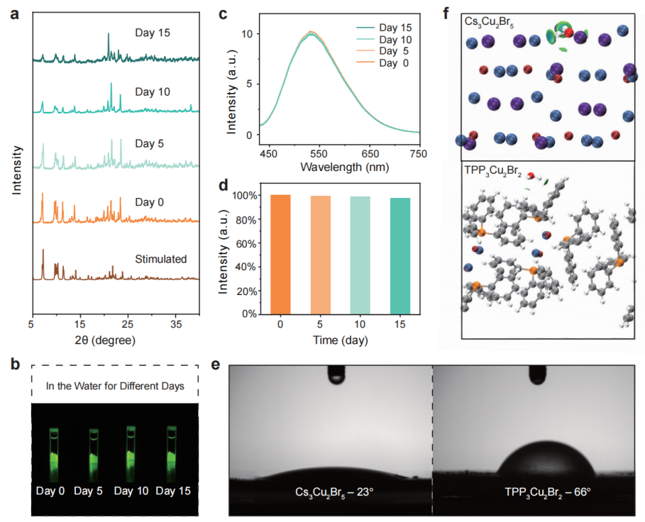 图2 (a-d) TPP3Cu2Br2在水中的稳定性;(e-f) Cs3Cu2Br5和TPP3Cu2Br2的接触角测试与结合能计算。