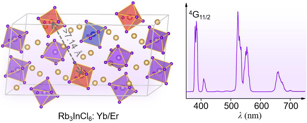 图1 Yb3+/Er3+共掺零维Rb3InCl6反常强紫外上转换发光:晶体结构示意图与上转换发射光谱。