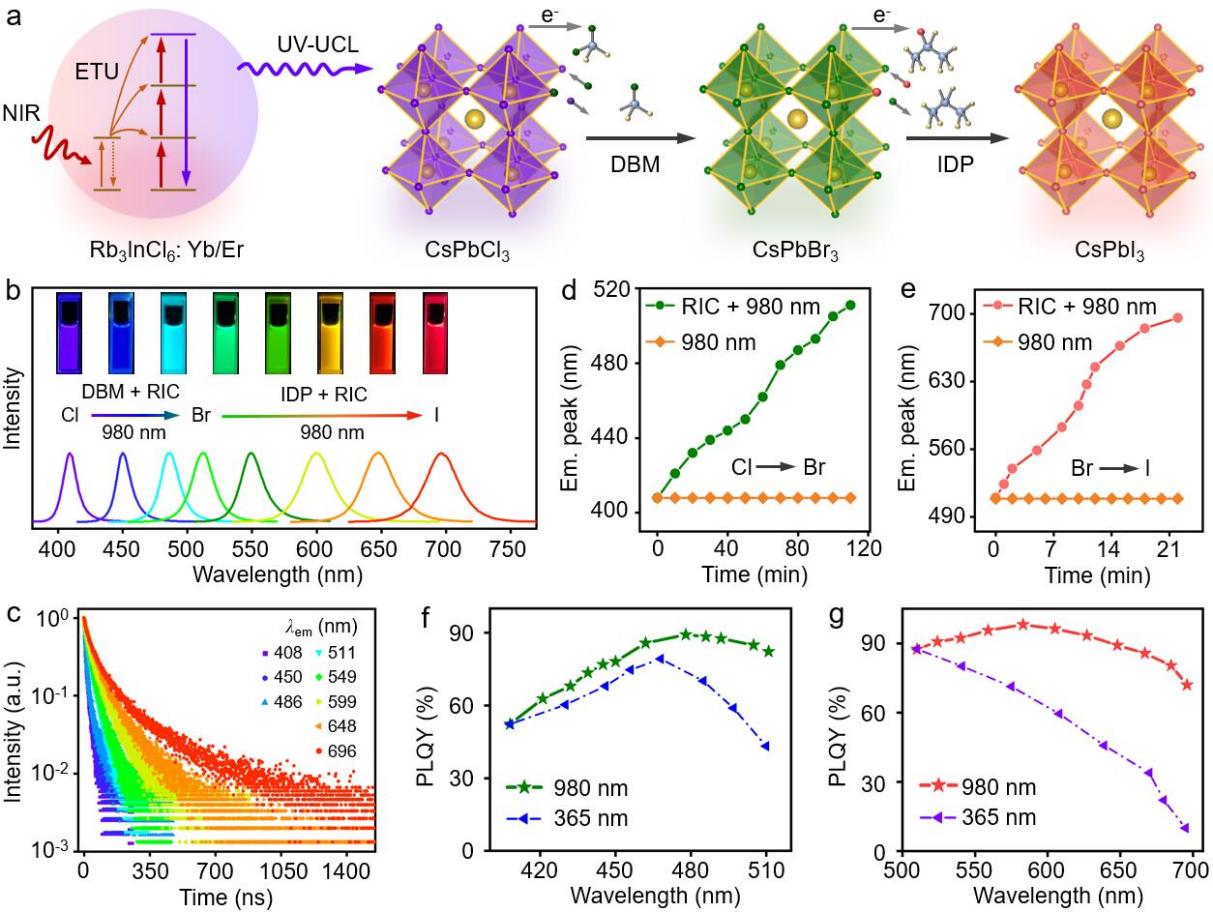 进一步地,团队利用Rb3InCl6: Yb3+/Er3+纳米晶的强紫外上转换发光,将其应用于近红外光控CsPbX3(X = Cl,Br,I)钙钛矿纳米晶的离子交换。在980 nm激发下,Rb3InCl6: Yb3+/Er3+的强紫外上转换发光可被CsPbX3吸收,从而促进钙钛矿纳米晶到二溴甲烷和碘代丙烷等卤代烷烃的电子转移,使得卤代烷烃的碳-卤键断裂释放卤素离子,并与CsPbX3纳米晶发生离子交换反应。利用980 nm近红外激光的远程操控,不仅可以避免长时间紫外光照对钙钛矿纳米晶造成光损伤,还可以通过调节激光的开启/关闭、辐照时间和激光功率实现对交换过程的远程控制,获得在不同波段(408−696 nm)高效发光(PLQY:52.3−98.1%)的混合卤素CsPbX3纳米晶(图3)。