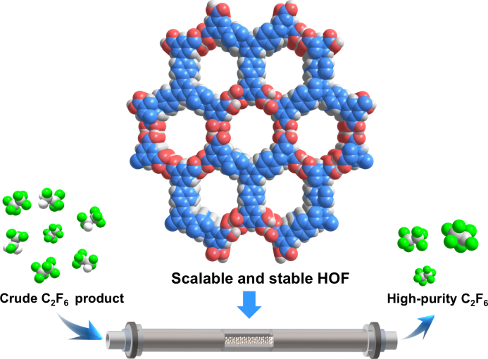 六氟乙烷(C2F6)是一种非常重要的含氟电子特气,但是其粗产物中通常含有少量的氢氟乙烷杂质并且难以通过常规蒸馏法去除,因此要开发有效的吸附剂用于C2F6的纯化。目前已经报道的C2F6纯化材料主要为MOF材料,它们通常缺乏足够的稳定性。此外,无法规模化的制备也限制了它们在工业中的应用。因此需要开发具有高效,稳定且能够规模化的吸附剂用于C2F6纯化。