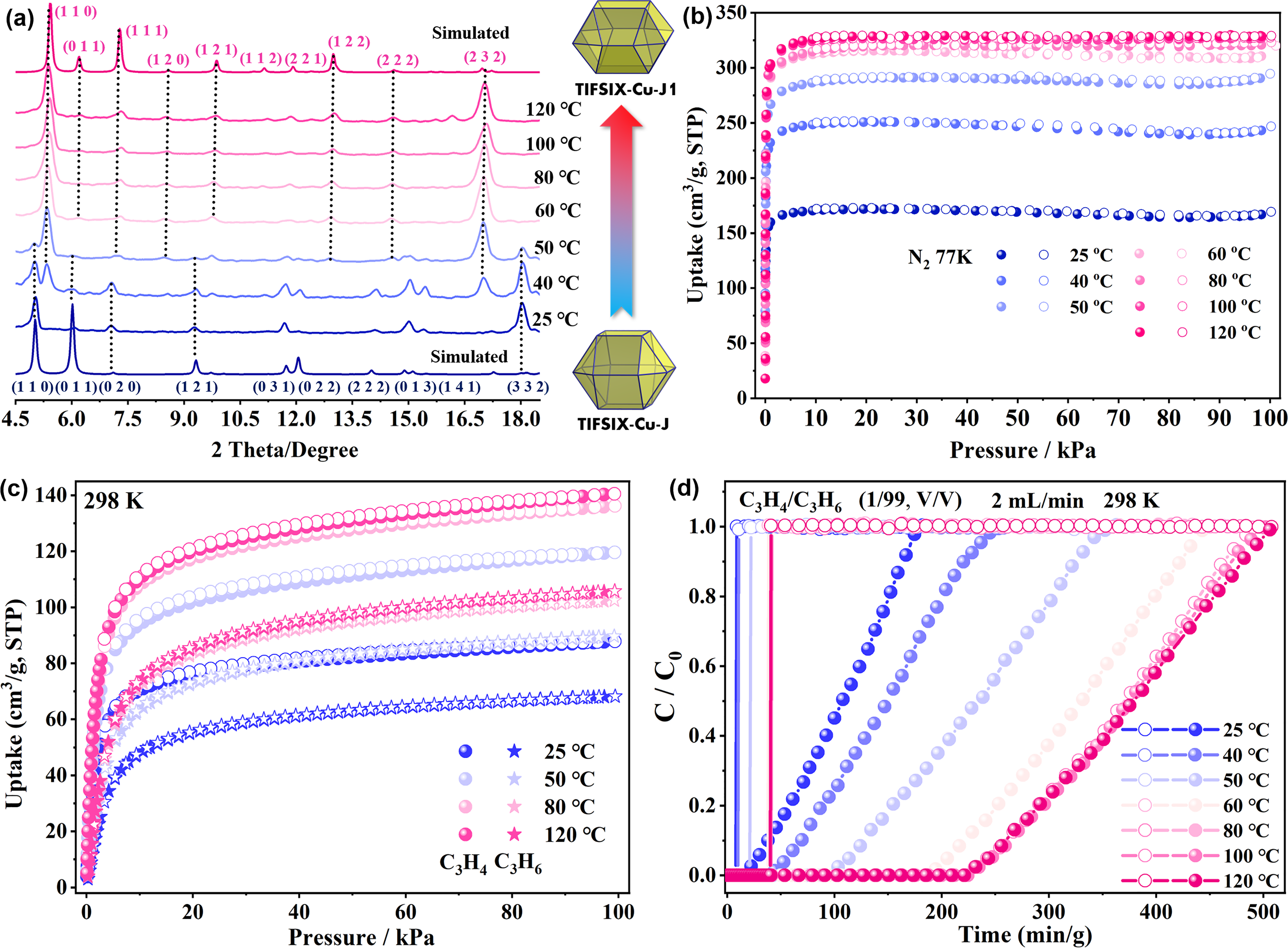 图2. TIFSIX-Cu-J原位转变为TIFSIX-Cu-J1过程的粉末、吸附及分离性能变化。