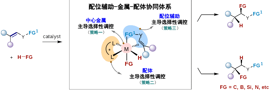 烯烃转化是现代有机化工的基石,是合成方法创新的重要源泉。内烯烃的催化转化面临反应性低、立体控制难、副反应多等问题,其区域选择性、非对映选择性、对映选择性催化转化是化学家长期面临的挑战。我们发展了配位辅助协同调控策略,利用烯烃及配位基团的双位点配位模式,实现了多类内烯烃的区域选择性及立体选择性氢官能团化,并揭示了内烯烃不对称催化转化中的选择性控制机制,为内烯烃高效转化利用提供了新的方法和思路。
