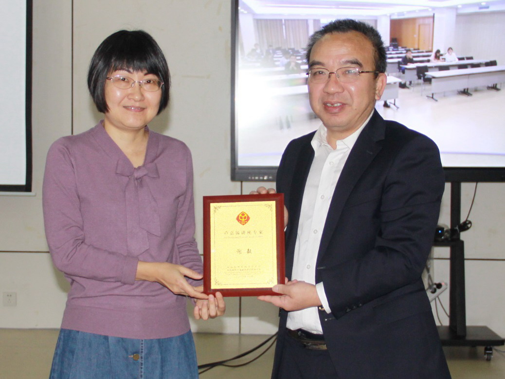 曹荣(右)为谢毅院士(左)颁发“卢嘉锡讲座专家”荣誉纪念牌