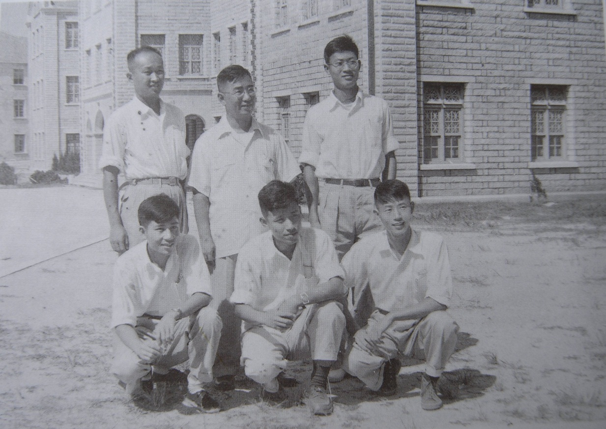 1956年10月,卢嘉锡与1956届研究生在新落成的厦门大学化学馆前合影。后左起:陈元柱、卢嘉锡、胡盛志;前左起:林景臻、庄启星、李宋贤