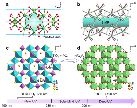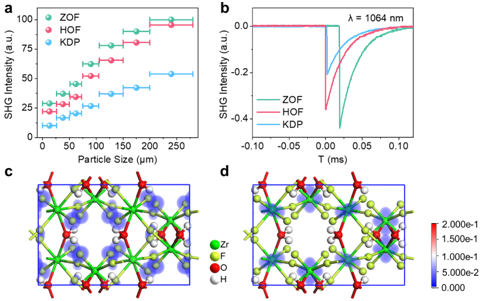 在这项研究中,研究团队首次提出了等网络分子设计策略,以著名的商业化二阶非线性光学晶体磷酸钛氧钾KTiOPO4 (KTP)为结构模型,通过改变KTP三维结构中功能网络节点的过渡金属多面体基元种类,将有效电负性低的d0过渡金属中心基元[MO2F6] (M = Zr, Hf)取代经典KTP结构中的[TiO6][PO4],创制了第一例具有类KTP结构构型的d0过渡金属氧氟化物ZOFHOF。相比于过渡金属[TiO6]多面体基元,ZOFHOF中的过渡金属锆/铪阳离子中心基元具有高的氧氟比;与高价过渡金属多面体基元相比,四价d0过渡金属锆/铪阳离子具有较低的有效电负性,可以有效地阻碍金属多面体中氧/-金属的电荷转移。在此类金属多面体体中引入电负性最大的氟原子,并尽可能增加金属多面体中F/O比,会显著改变材料的电子能带结构,为其紫外吸收截至边的蓝移提供了极大的可能性。尤为重要的是,d0过渡金属中心多面体的长程有序的微观排列方式有利于材料表现出强的二次谐波效应。