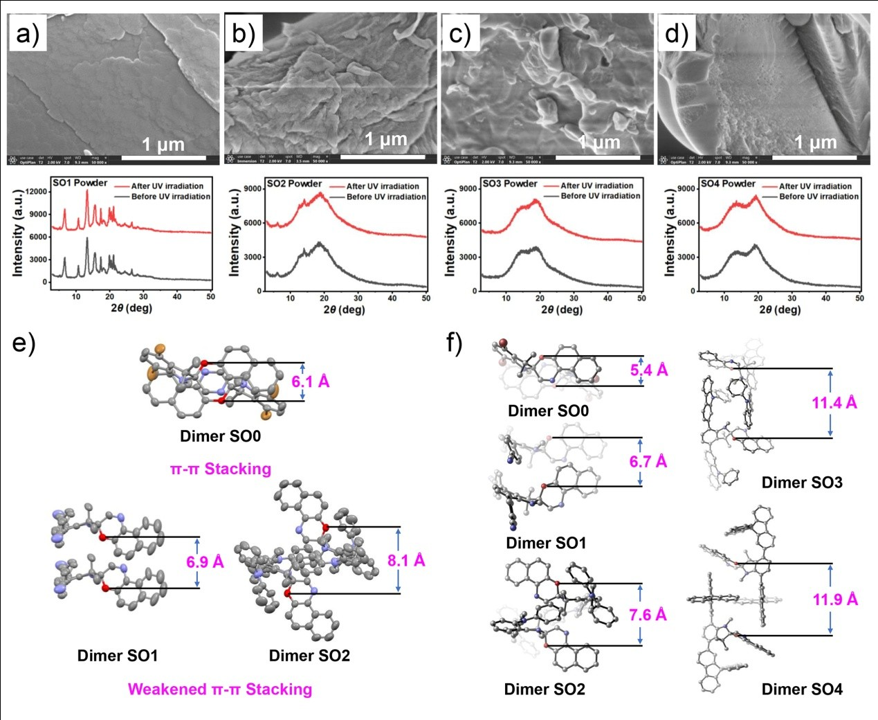采用扫描电子显微镜及粉末X-射线衍射结果表明,随着引入芳基体积增大,分子间排列由紧密堆积趋向于松散排列,分子间距离增大,为固态时光致变色反应提供足够的空间(图3a)。单晶结构数据显示该类化合物分子间存在弱的π-π堆积,分子间的距离随引入的芳基体积增大而增大,理论计算结果与单晶数据一致(图3b-c),二者均表明螺噁嗪吲哚环上4-, 7-位的芳基为分子间提供了足够的空间,是固态光致变色的充分必要条件。