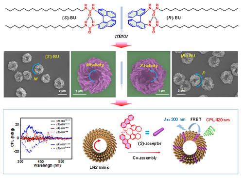 上述团队在前期溶液手性自组装研究的基础上,发展了一种“溶液-界面联合多级自组装”的新策略,实现了手性从分子层次到微米层次的跨尺度传递与精确控制。在本项研究中,该团队设计合成了一系列联二萘手性双脲组装基元,经由程序降温在溶液中制备了具有纳米尺度的聚集体;这些纳米聚集体在溶剂蒸发和界面张力的驱动下,可进一步在二维基底上发生融合与再组装,形成具有微米尺度的单分散同手性螺旋微环结构。基于变温光谱、单晶衍射和电镜等结果,以及密度泛函计算和分子动力学模拟等理论分析结果,他们提出了一种“聚集-环化”的分级组装机制,揭示了微观结构手性调制的圆二色性与圆偏振发光性能的构效关系。通过掺杂手性受体染料,该团队还发展了基于自组装手性螺旋微环的兼具环形与圆偏振光特征的新型手性捕光天线模型(图)。