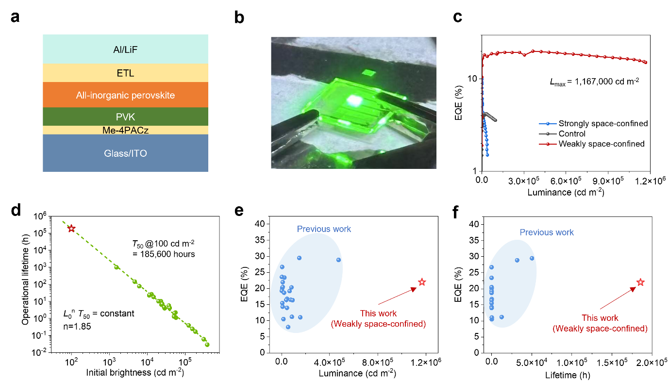 2a.钙钛矿LED结构;b.钙钛矿LED工作时照片;c.三种不同空间限域钙钛矿LED的亮度和效率关系曲线;d.弱空间限域钙钛矿LED寿命外推拟合曲线;e, f.目前已发表的绿光钙钛矿LED效率分别和亮度(e),寿命(f)的统计